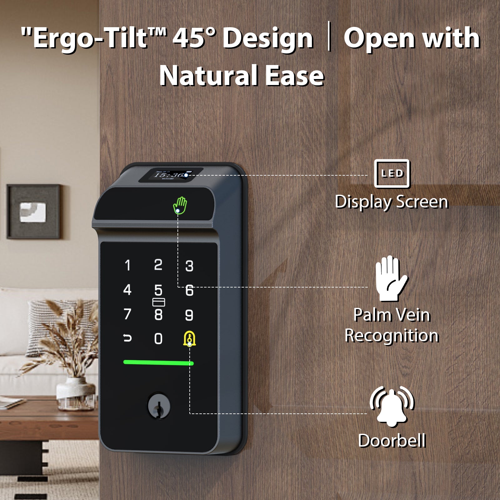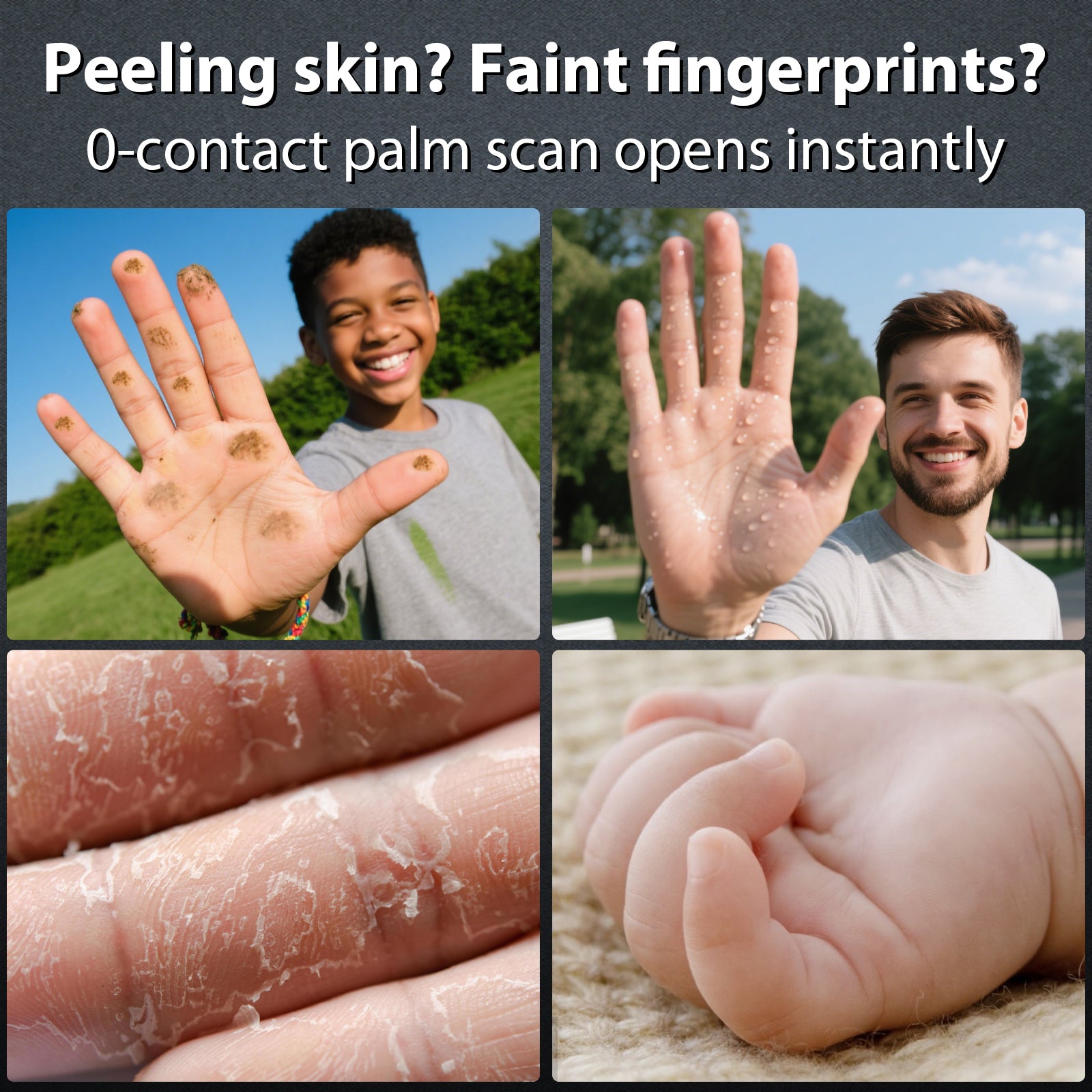 - 【Touchless Palm Vein Tech】 Unlock with a wave. Solves fingerprint issues for seniors/kids – immune to dry/cut/moist skin at 99% accuracy in 0.2s. Hygienic, zero surface contact. 6-In-1 Keyless Door Lock with Bluetooth App, Palm Vein, RFID Card, NFC, password, or key.100% local data storage protects privacy.